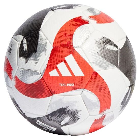 Der Adidas Fußball „Tiro Pro“ besteht aus einer nahtlosen, thermisch verklebten Oberfläche. Der Ball nimmt somit z. B. bei Regen kein Wasser auf. Das gewährleistet konstante Eigenschaften hinsichtlich Ballannahme sowie Rücksprung- und Flugverhalten. Damit ist er auch bei intensiver Dauerbeanspruchung ideal geeignet für den regelmäßigen Spielbetrieb. Das belegt auch seine Auszeichnung mit dem höchsten Qualitäts-PrüfzeichenGrafische oder schriftliche Markierungen an Produkten, Maschinen und Fahrzeugen, die die Einhaltung bestimmter Sicherheits- oder Qualitätskriterien anzeigen. FIFA Quality ProSteht für höchste Qualitäts-Norm. Hierfür müssen die Fußbälle alle Tests in einem strengen Prüfverfahren durchlaufen. Zusätzlich wird er auf Größe und Formstabilität geprüft. Das Siegel FIFA Quality Pro ersetzt das bisherige Siegel FIFA Approved..